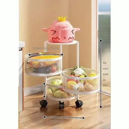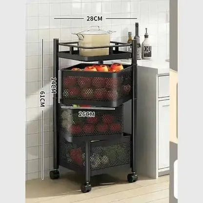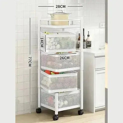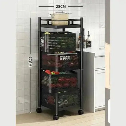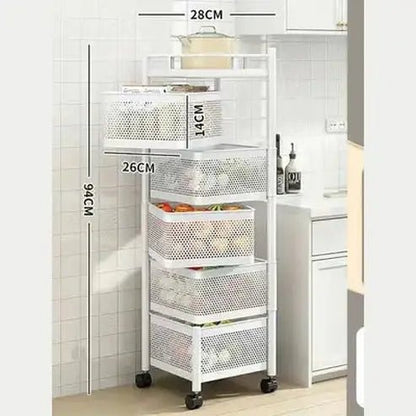 A rolling storage cart with five metal tiers, ideal for kitchen use. This versatile storage basket with wheels serves as a market basket holder, providing ample space for organizing sundries, pantry items, and produce, making it an efficient vegetable storage solution.