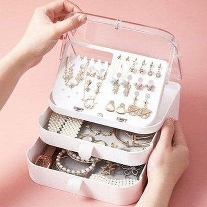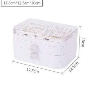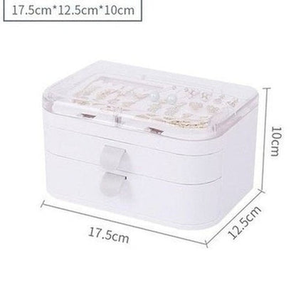 Double-layer clear travel jewelry storage box for necklaces, earrings, bracelets, rings, general jewelry.