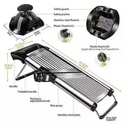Strong and durable kitchen food cutter. Vegetable grater with adjustable blades in 304 stainless steel Manual with safety mandolin.