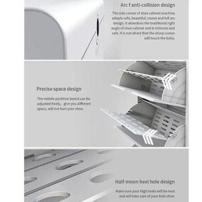 Quiet and save electricity humanization design, the taste of life Weak and weak Slight voice Be quiet Very quiet Hardly audib CAREFUL DETAIL DESIGN SHOWS MORE TASTE OF LIFE Are fanti-collision design The side corner of shoe cabinet machine adopts safe, beautiful, round and full arc design. It abandons the traditional right angle of shoe cabinet and is intimate and safe. It is not afraid that the sharp corner will touch the baby.