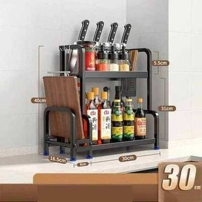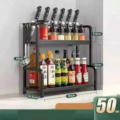 Keep your kitchen organized and your favorite spices within easy reach with our Stainless Steel Seasoning Organizer Knife Storage Shelf. This two-tier spice storage rack is designed to fit perfectly in your kitchen, providing a convenient solution for storing and organizing your seasoning bottles.