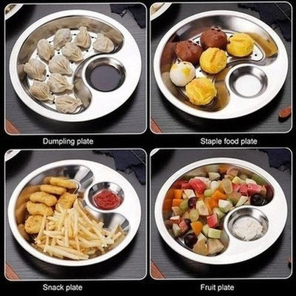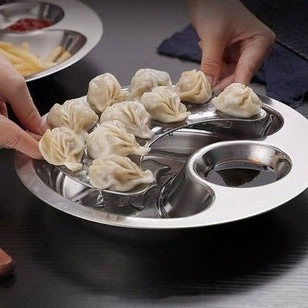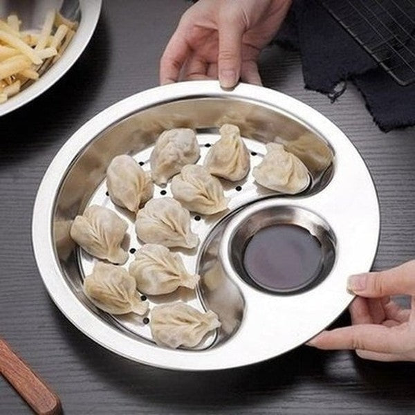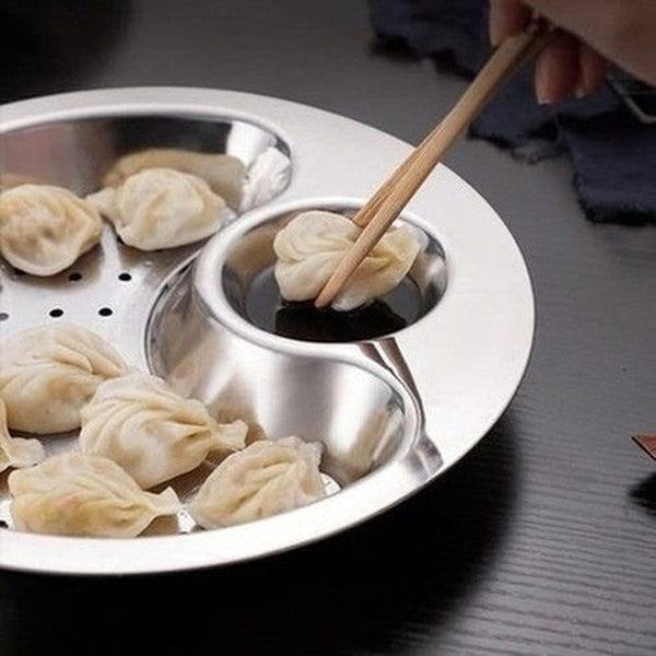 This stainless steel plate can instantly drain the oil and water from your dumplings and fried foods! It is multi-used design that comes with a sauce container and a layer of hollowed holes, saving space on your dining table.